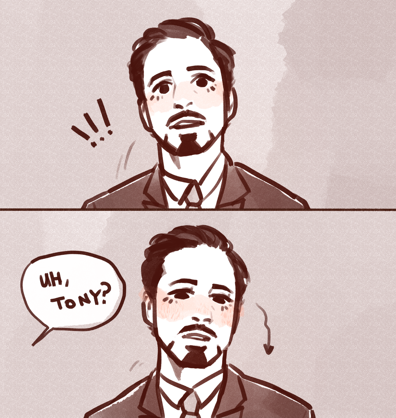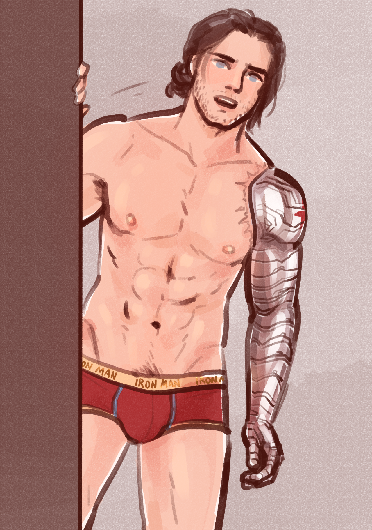 I’m so excited you are taking prompts! I have a scene in a story I’m writing where Bucky rushes to rescue Tony wearing only his boxers, so I would love to see a picture of Tony in his suit admiring Bucky in his underwear :)